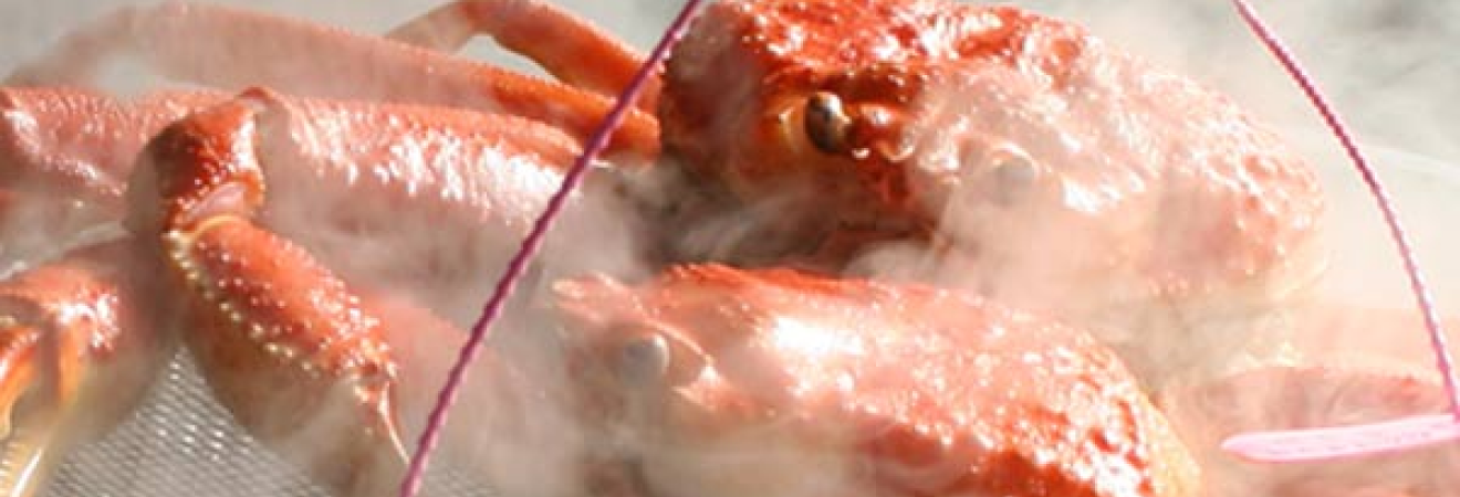 松葉がにで1分、紅ずわいがにで30秒、もし茹で時間を間違えると、たとえ一匹数万円のかにであろうが商品にならない・・・これが、この道45年の職人であっても緊張するかにの釜茹でです。それは、まさに時間との戦い。経験と勘で「その茹で分けを知り、覚えている者しか、かに茹では出来ません。