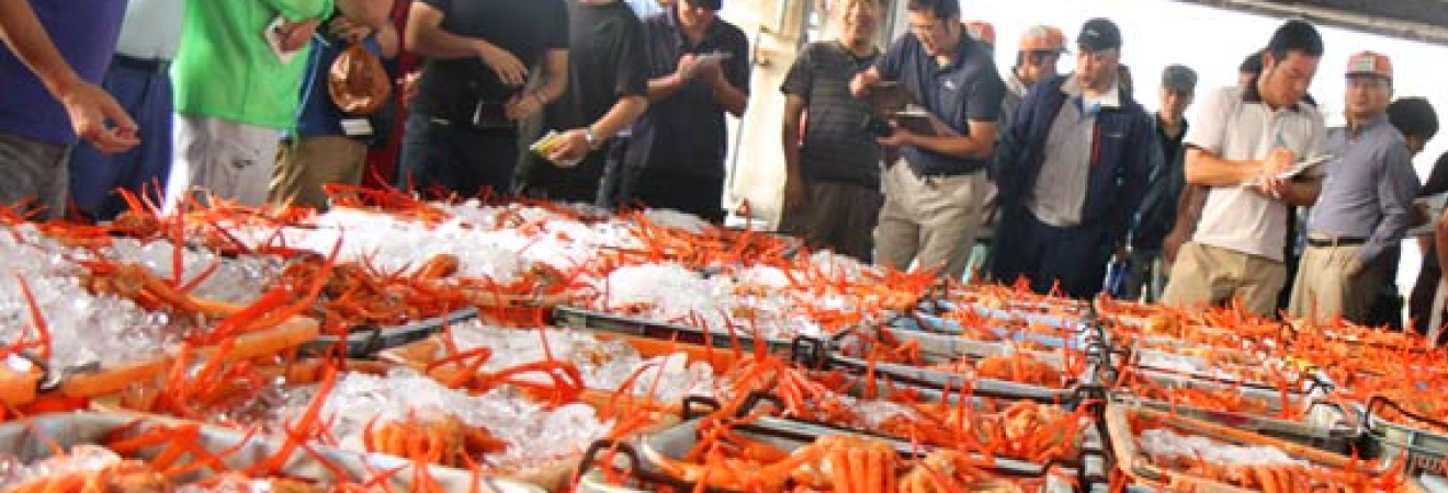 最後に価値を決めるのは、仲買人の「眼力」。柴山漁港の松葉がにの選別は日本一。何と100ランク以上にもなります。選り手(よりて)と呼ばれる女性たちが丹念に丁寧に、場合によっては数時間かけて仕分けるのです。しかし、いくら細かく仕分けられたかにでも、その価値を見極めるのはあくまでも仲買人。その眼力、目利きの確かさ、資質の高さによって、最後にかにの値打ちは決まってゆくのです。
